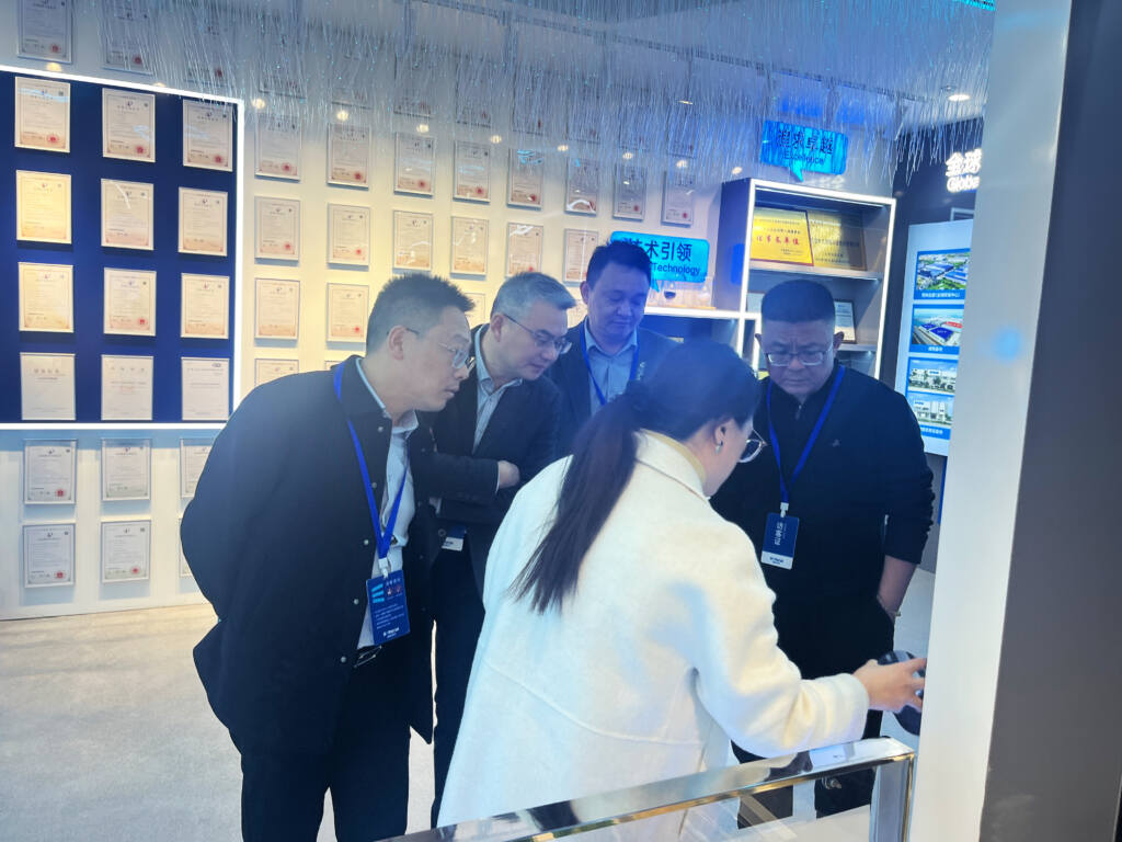 考察首站为百佳年代的企业介绍展厅,在工作人员的讲解下,通过实物展品、荣誉墙及多媒体影像等多元形式,系统呈现了百佳年代从传统制造向智能科技转型的发展历程与业务布局,政企三方共同沉浸式了解百佳年代的发展史与核心产品。